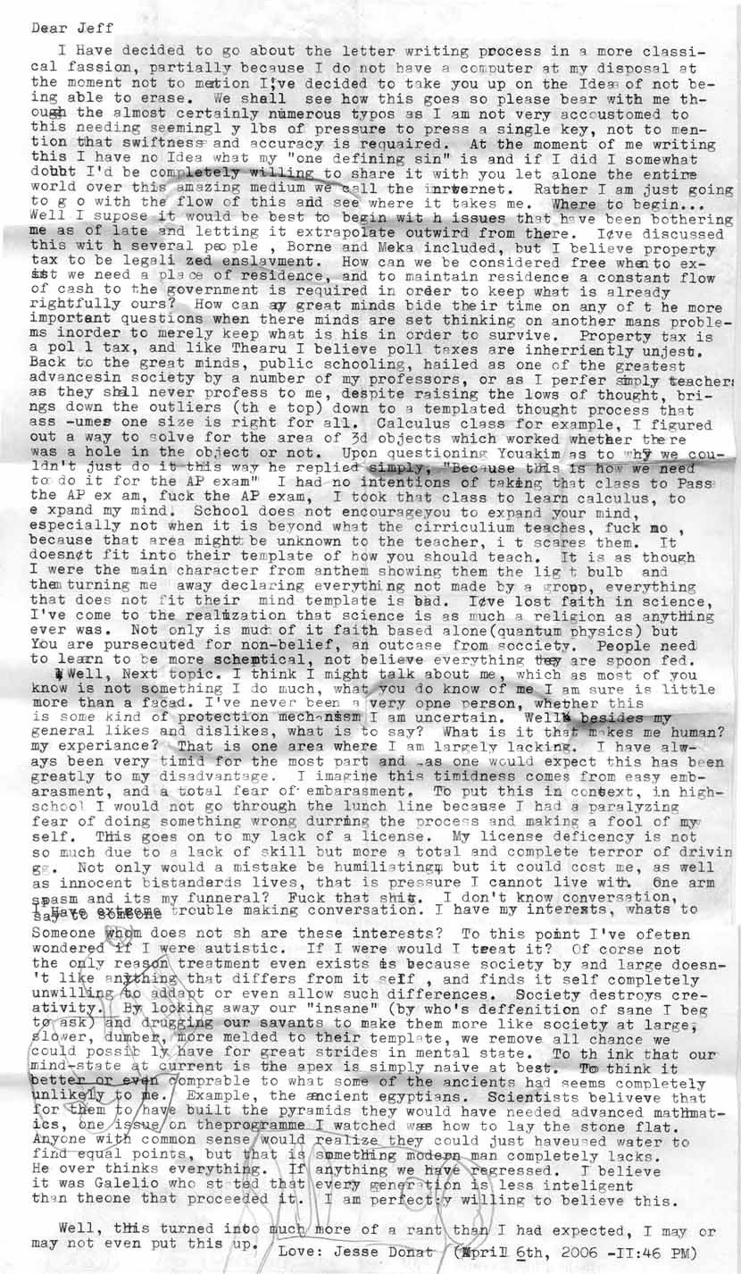 Well this was completely randomly tossed together at 4am this morning. I’m not sure who knows this, I know Borne does, but I have a lazy eye and when I get tired it becomes increasingly hard to control. My eyes right now are looking in two completely different directions and neither in focus. On the love at the end of my previous letter, it was more along the lines of uncertainty as to the spelling of something more extravagant such as ‘Sincerely’ but it was not overly uncomfortable to use.